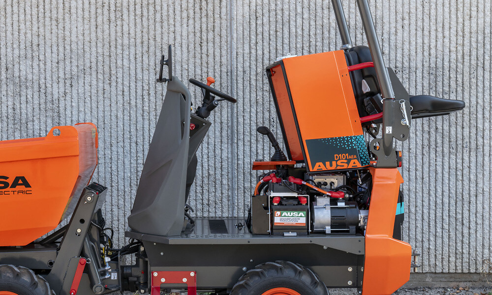 The D101AEA electric dumper has a 1,000 kg (2,200 lb) payload and features a hi-tip skip, which is capable of lifting and tipping at a height of up to 1.6 meters (5.2 ft).