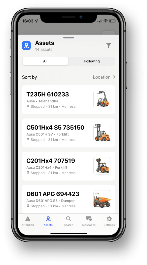 Activate AUSA's recommended maintenance alerts and keep your machines in tip-top condition. And, for your security, you can program geofences and receive alerts if they go outside the established boundaries.