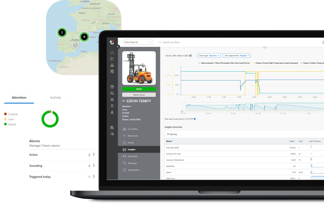 Vanuit uw kantoor of met uw mobiele telefoon. Beheer al uw AUSA-machines in realtime. Met AUSAnow kunt u vooruitlopen op defecten en onderhoud om zo stilstandtijden te reduceren.